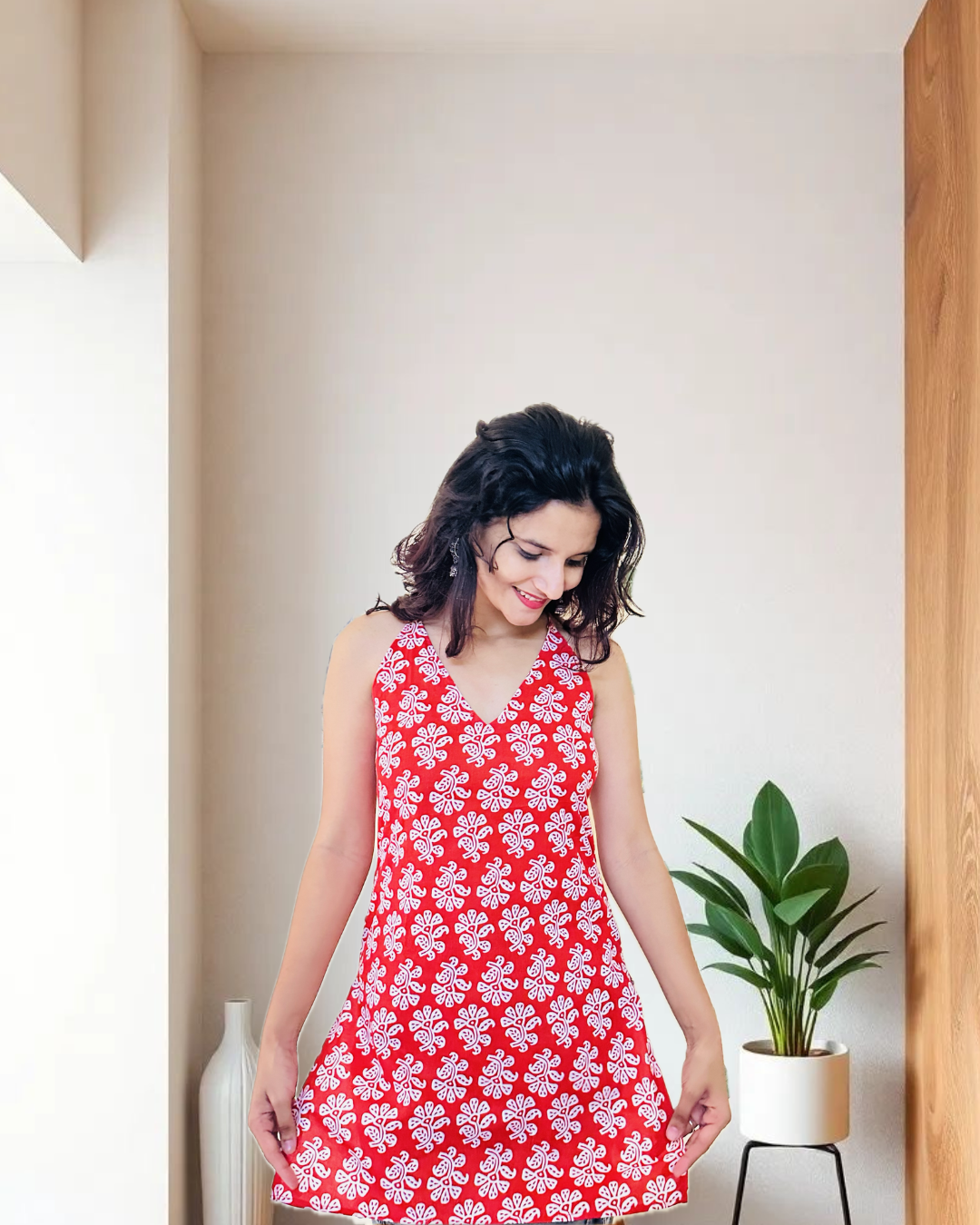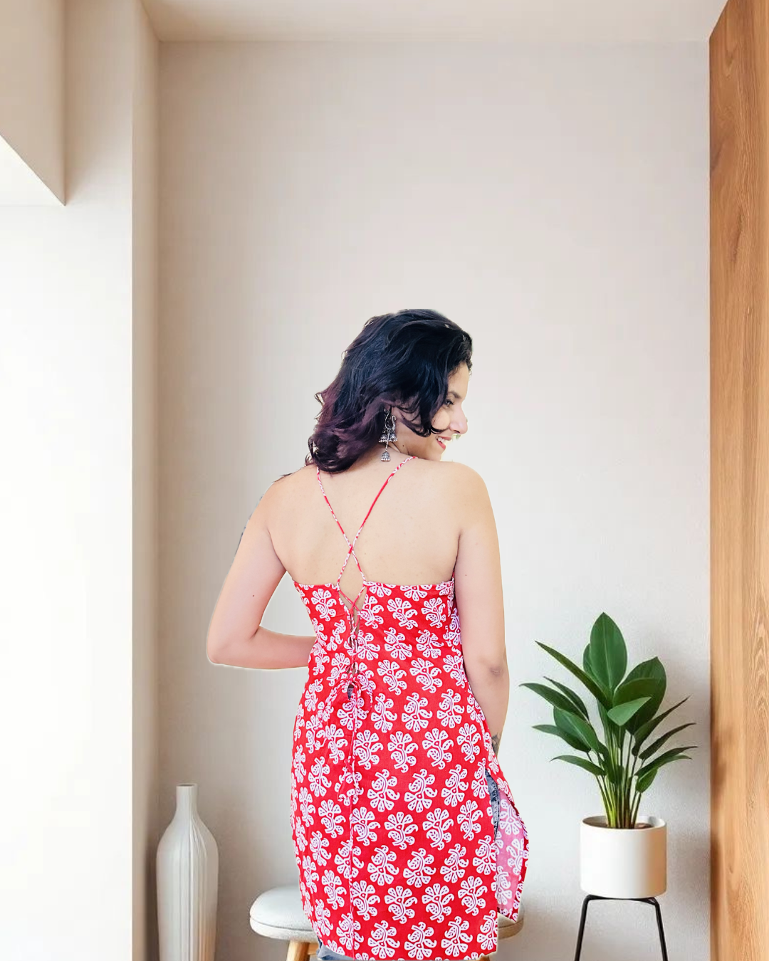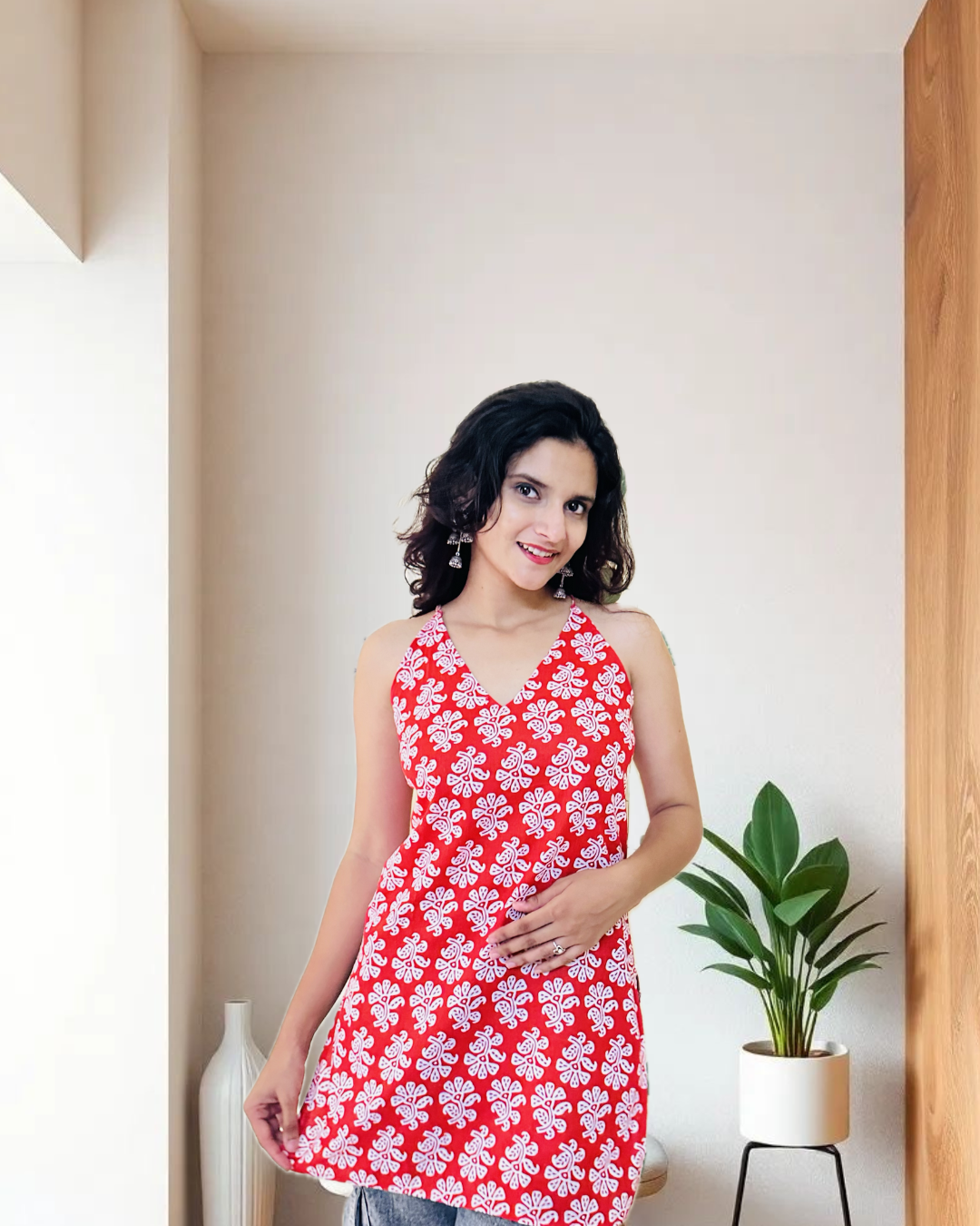 Red & White Floral Print V-Neck Kurti with Crisscross Back