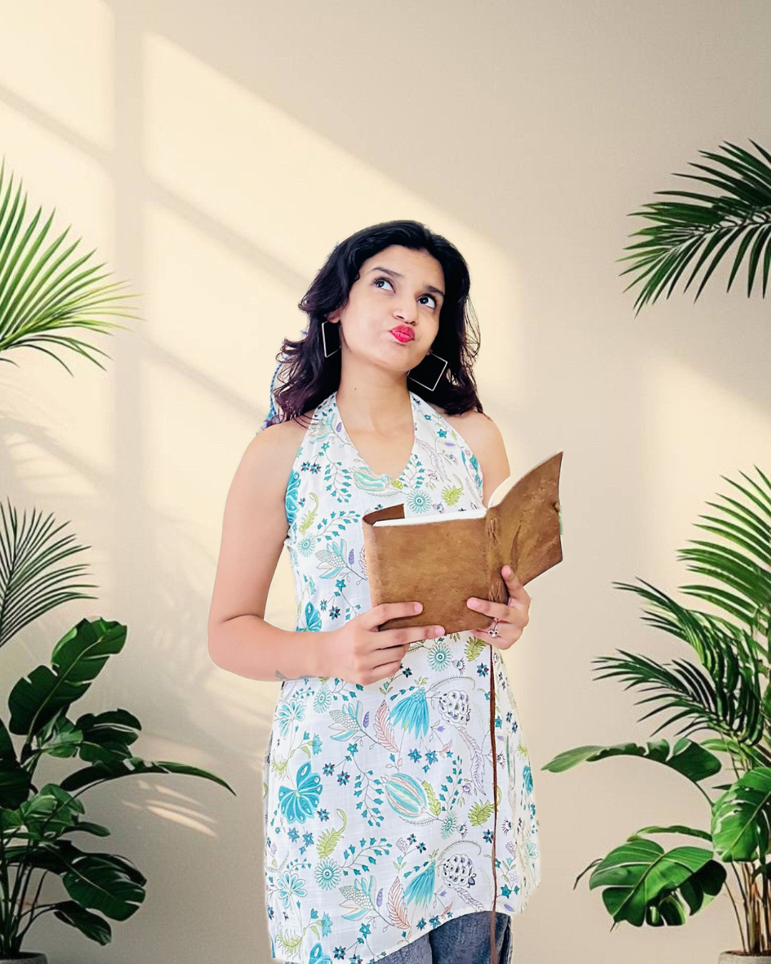 Stay trendy and playful with this white floral halter-neck cotton kurti, a perfect blend of comfort and style. Designed with a halter tie-up neckline and a breezy sleeveless cut, this kurti adds a youthful, modern vibe to your wardrobe. The soothing white base is enhanced with aqua blue, green, and lilac floral prints, making it a refreshing choice for summer days, casual outings, or even beach vacations. Its lightweight cotton fabric ensures you stay cool while looking effortlessly chic.